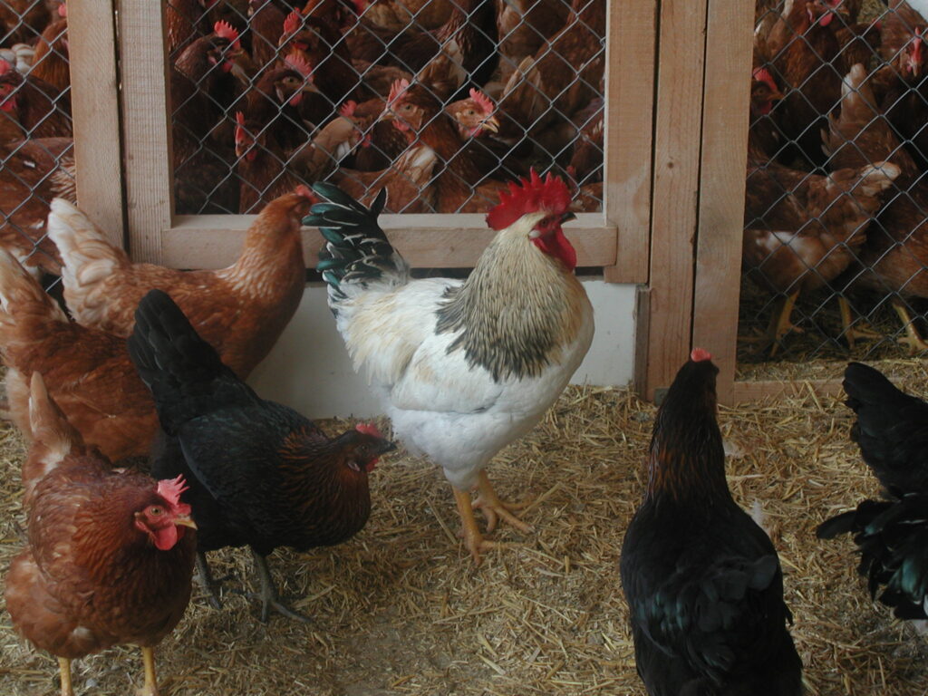 Legehennen mit erwachsenem Hahn auf einem KAGfreiland-Hof, vorn im frei zugänglichen gedeckten Auslaufbereich, hinten im Stall; die Weide ist hier nicht abgebildet. (Foto: Billo Heinzpeter Studer)