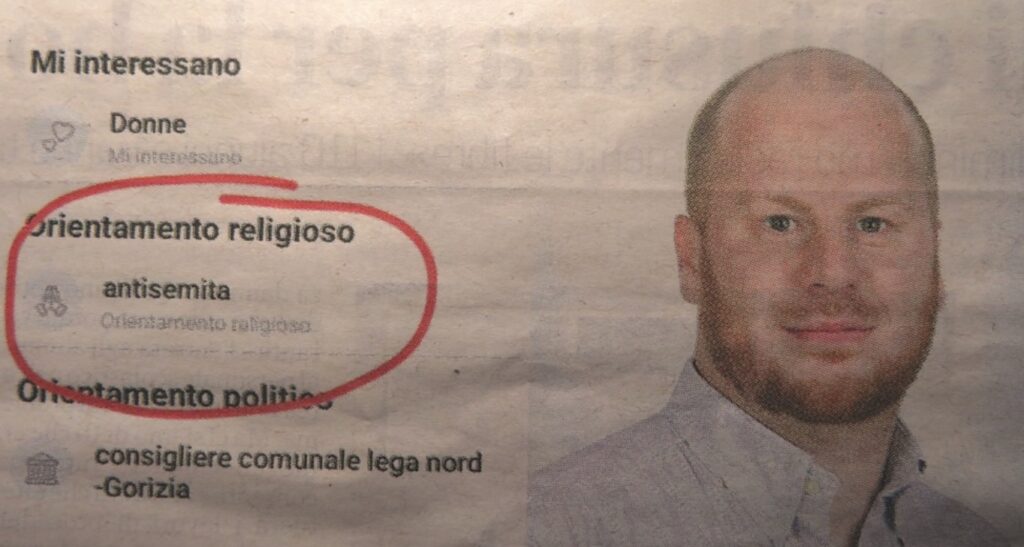 Ein Lega-Mitglied des Stadtparlaments von Gorizia, Stefano Altinier, vermerkte in seinem Facebook-Profil unter «Religiöser Orientierung: Antisemit».