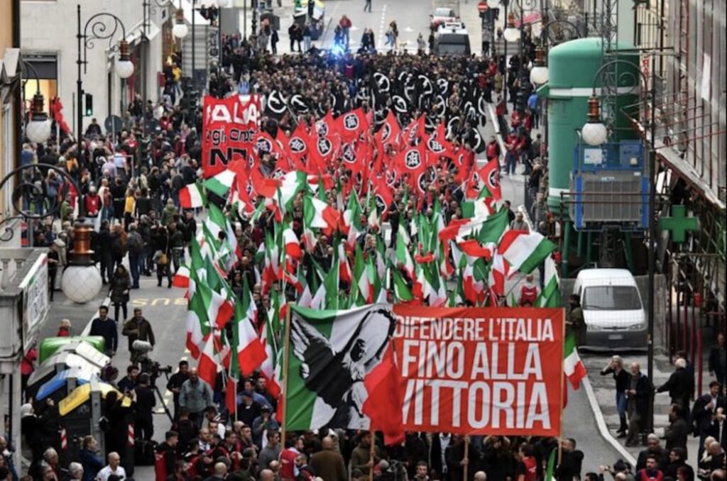 1) Fascists present themselves uniformed, dressed in similar way, waiving the same flags, either the national tricolour or the more than ugly tortoise flag of CasaPound, one of Italian’s fascist gangs, and marching in a military-like formation, carrying in front a kind of monstrance as if ti was a procession.