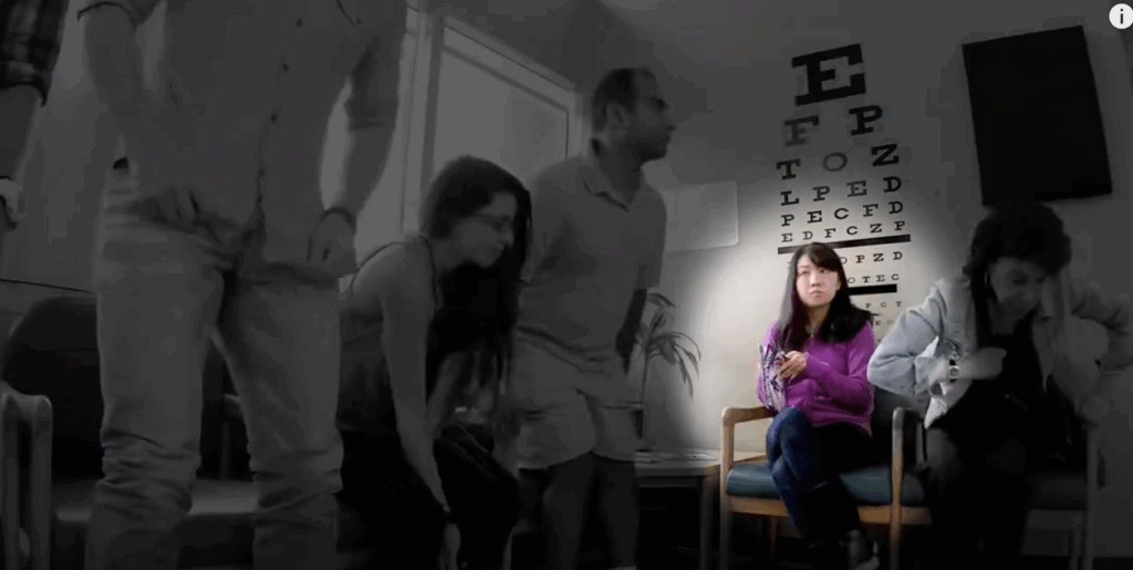 Ort: Wartezimmer einer Augenklinik. Eine Gruppe von angeblich wartenden Patienten wird instruiert, sich jedesmal vom Sessel zu erheben. wenn ein Signalton ertönt. Eine ahnungslos hinzukommende echte Patientin, violett gekleidet, bleibt zunächst sitzen, folgt dann aber dem Beispiel der Gruppe, als zum dritten Mal ein Signalton zu hören ist. Danach werden die gespielten Patienten der Reihe nach aus dem Wartezimmer gerufen, bis die Dame in Violett ganz alleine im Raum sitzt; sie erhebt sich dennoch bei jedem weiteren Ton. Dann kommt ein weiterer echter Patient hinzu, der erst staunt, als sich die Damen beim Signalton erhebt, doch beim dritten Mal fragt, warum sie das tue. Sie habe das halt so in der Gruppe der zuvor Wartenden erlebt und mitgemacht, erklärt sie. Weitere echte Patienten kommen hinzu, alle übernehmen sie das Verhalten, ein einziger mit sichtbarem Widerwillen, dann aber doch.