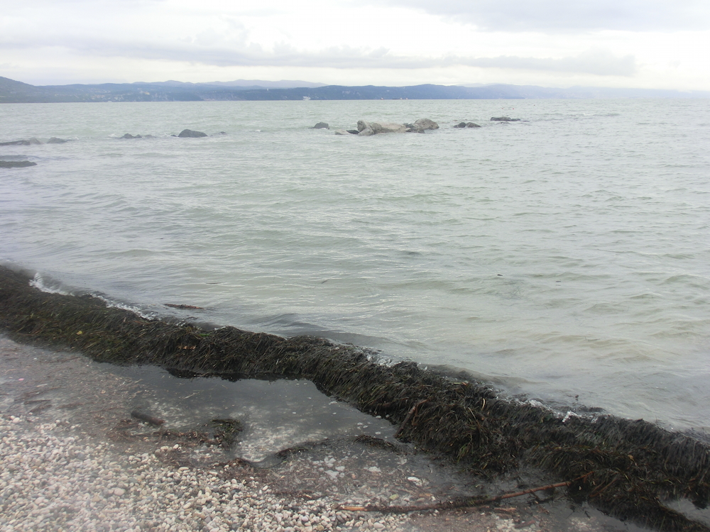 Weil der Meeresspiegel auch in der nördlichen Adria im Lauf der Jahre angestiegen ist – was aber kaum jemand wahrhaben will –, liegt eine meterhohe Mole aus Felsblöcken bei Südwind unter Wasser. (Foto: Billo. 2015)